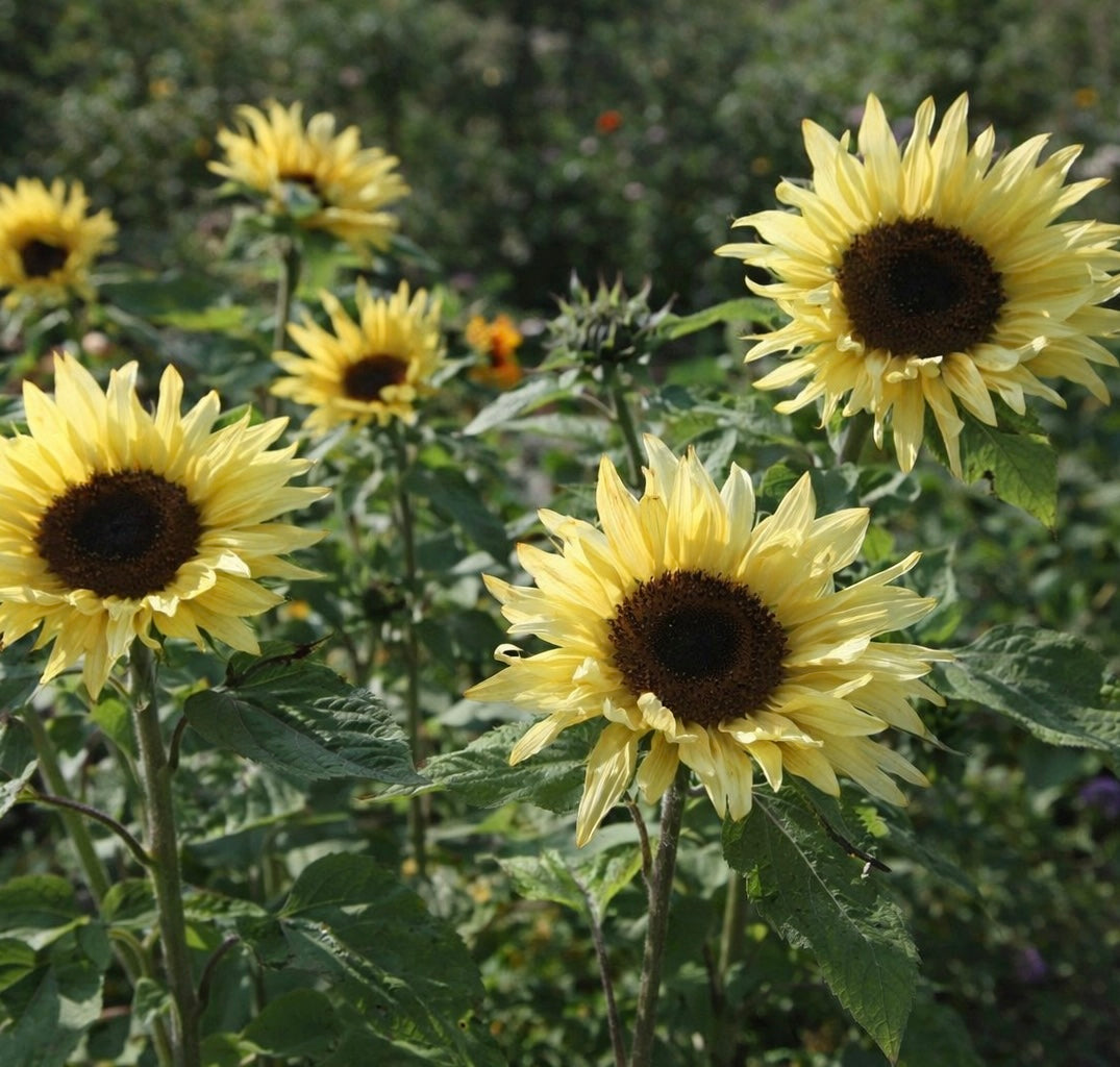 Enkelblommande solros med citrongula blommor med lite busiga kronblad och mörk mitt. Solrosen får stadiga raka stjälkar.